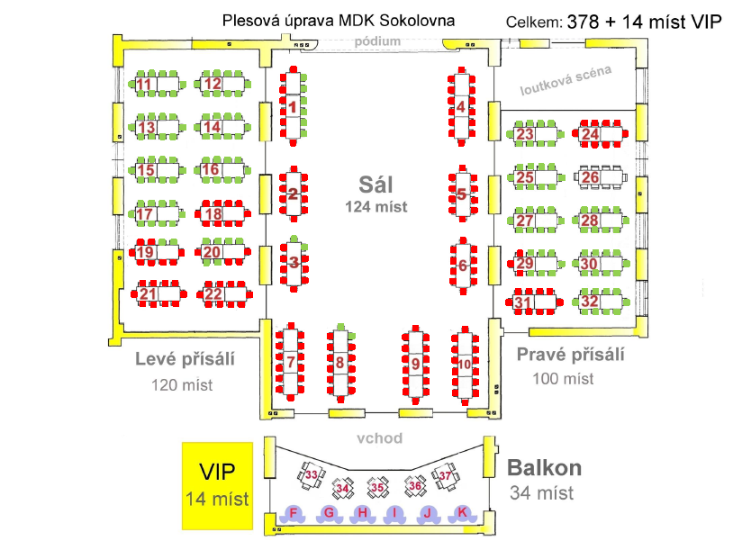 Aktuální obsazenost sálu (červeně vyznačená obsazená místa):